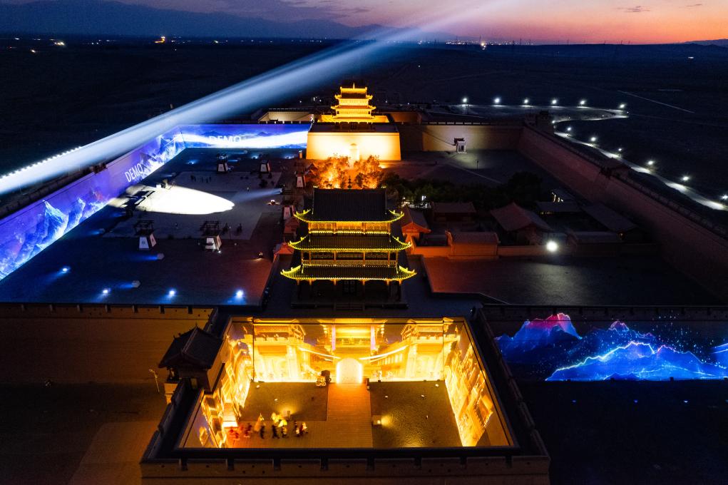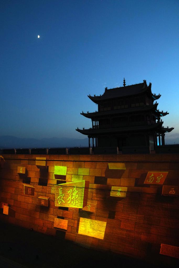7月14日晚在甘肃省嘉峪关市嘉峪关关城景区拍摄的夜游灯光剧《天下嘉峪关》光影效果↓