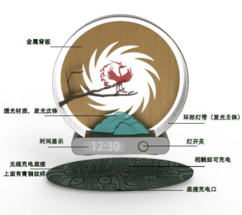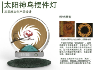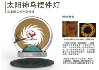 灵感来源于金乌负日和太阳神鸟纹。中国古代神话“金乌负日”,描述了太阳中央有一只黑色的三足乌鸦,负载着太阳进行东升西落的活动。金乌作为太阳的化身,不仅承载着古人对太阳神性的崇拜,也象征着光明、温暖和希望。