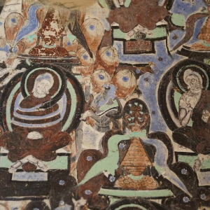 研究者认为,克孜尔石窟在壁画题材和艺术风格等方面经历了早、中、晚三个时期。早、中时期的壁画,内容上以佛本生故事、因缘故事和佛教故事为主。晚期的壁画出现大乘佛教的千佛题材。