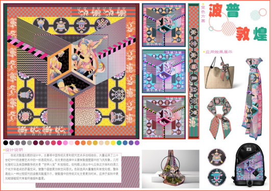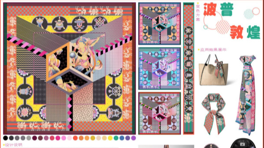 色彩选用大量撞色和渐变处理,整体给人一种比较现代的波普风敦煌方巾,使敦煌中的传统文化元素更加时尚,应用于实际中更加能够被现代审美所接受和喜爱。