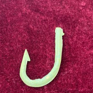青铜色的鱼钩钩柄较大,呈弯弧形,内有倒刺,钩体两侧存在范铸法留下的范缝,长4.2厘米,宽2.5厘米,依稀可见其锋利的钩尖……