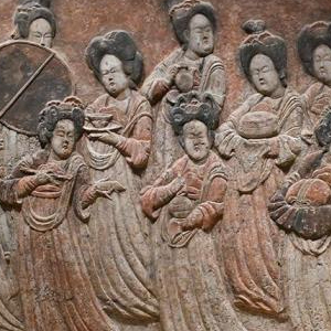 重磅展品包括河北博物院藏五代时期的彩绘浮雕散乐图和彩绘浮雕奉侍图,皆出土自曲阳县灵山镇西燕川村王处直墓。散乐图真实再现了唐末五代时期乐舞活动的场面,图中共有十五位人物,乐伎分别手持笙、箜篌、方响、筝、琵琶、筚篥、横笛、拍板、座鼓等乐器,人物面容饱满,神情专注,姿势各异,极富韵律感;奉侍图描绘了一支由十四人组成的队伍,画中的侍女们长裙坠地,动感飘逸,有的举着障扇,有的手持执壶、托盏、拂尘等各式生活用具,生动地表现了五代时期贵族的日常生活。