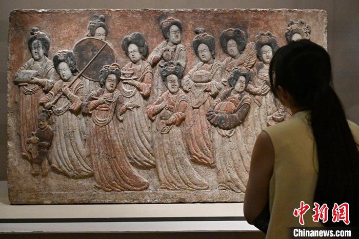 河北曲阳石雕艺术展现场的五代彩绘浮雕奉侍图。 田雨昊摄