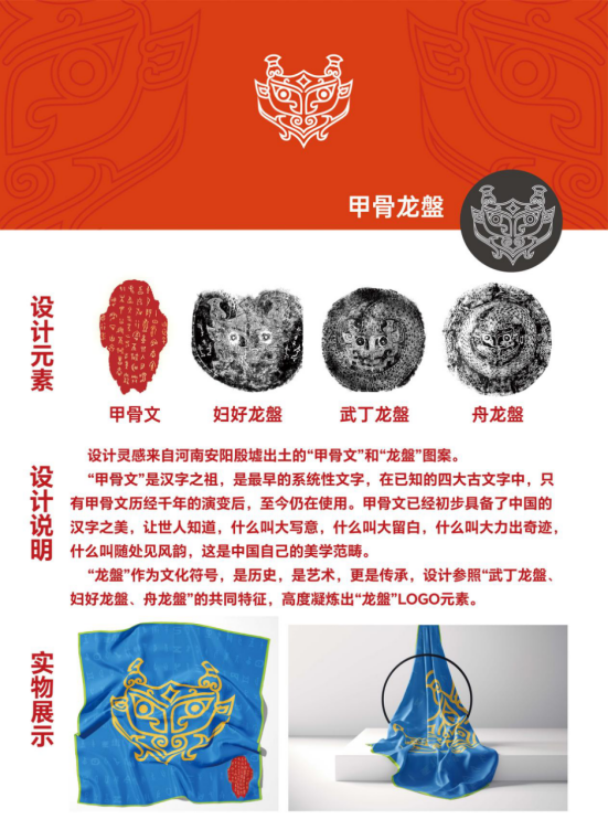 设计灵感来自河南安阳殷墟出土的“甲骨文”和“龙盤”图案,安阳历史悠久,文化底蕴深厚,伸手一摸就是殷商文化,两脚一踩就是青铜甲骨。