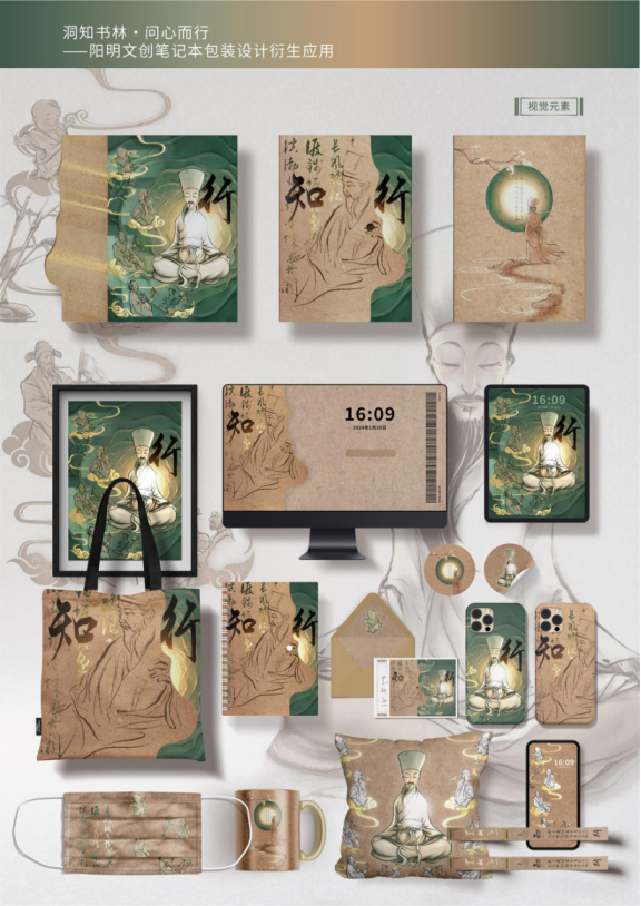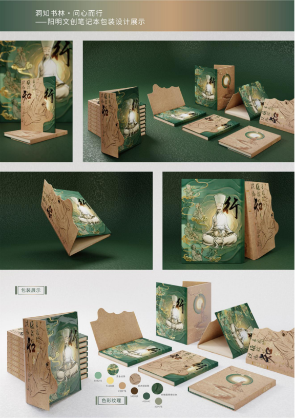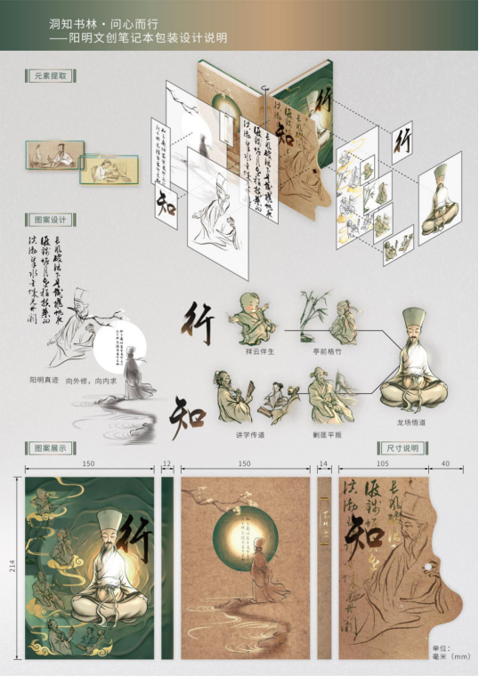 “洞知书林·问心而行”阳明文创笔记本围绕阳明心学中“知行合一”的核心理念设计,通过对阳明心学相关元素的刻画,分别以“知”与“行”作为封面与扉页的视觉主题,在一开一合之间将心中良知与行动实践的联系,融入到使用者的学习与创作之中。