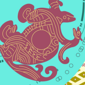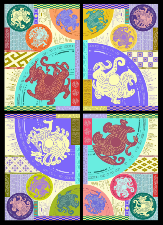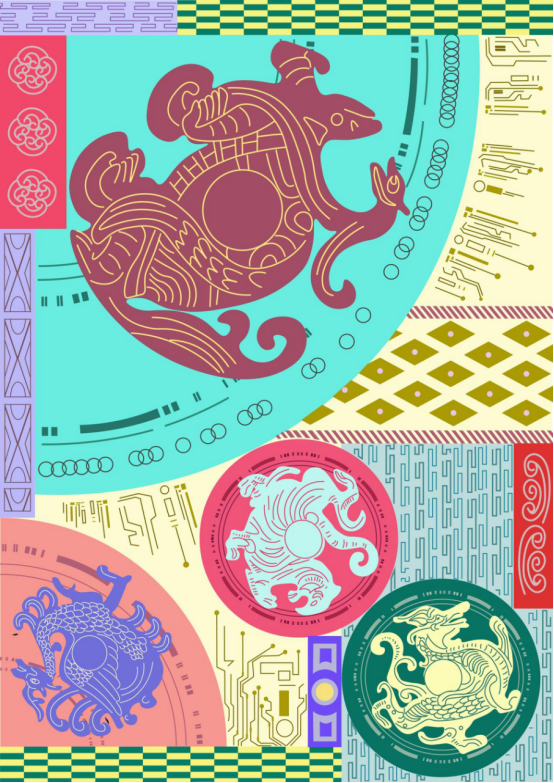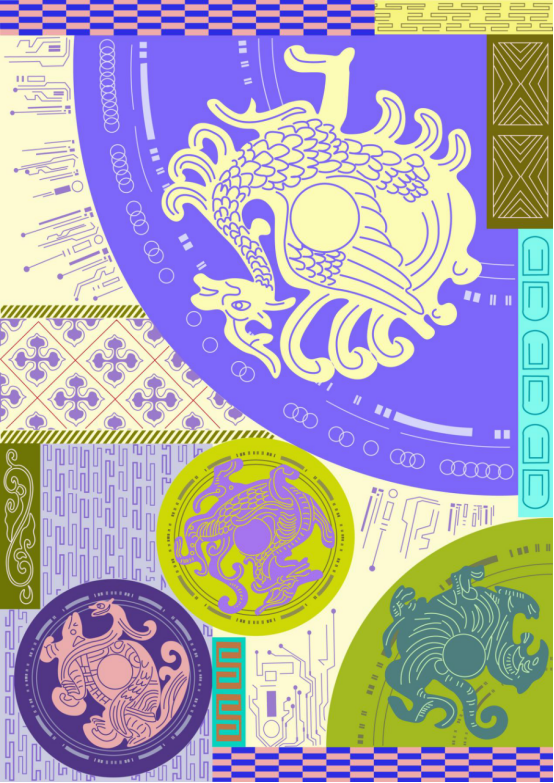 “电子线路”作为主要元素象征此次主题,画面整体采用紫色系与青色系列的配色,将瓦当图案与汉代纹样进行数字化处理,加以现代的网络格式元素点缀,以精细的线条和丰富的色彩重新呈现,绚丽明亮,古典中又予以着科技感。