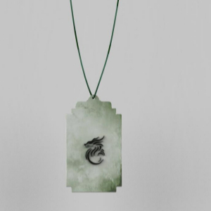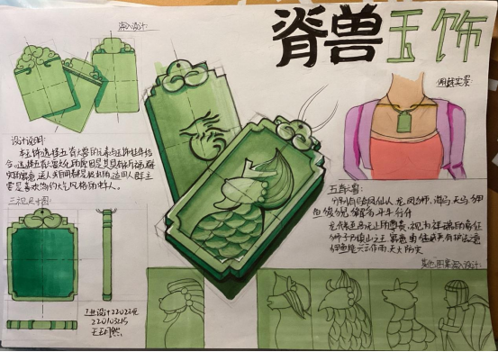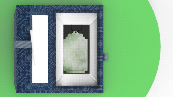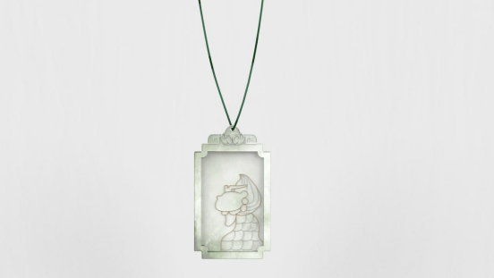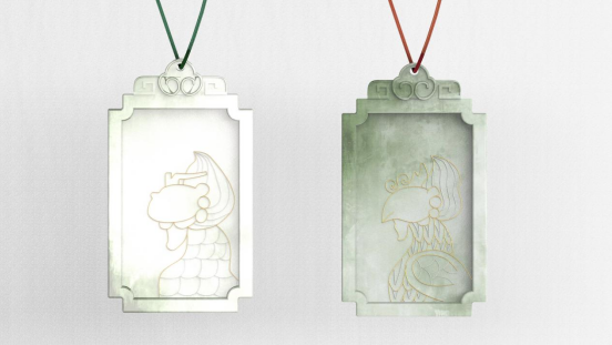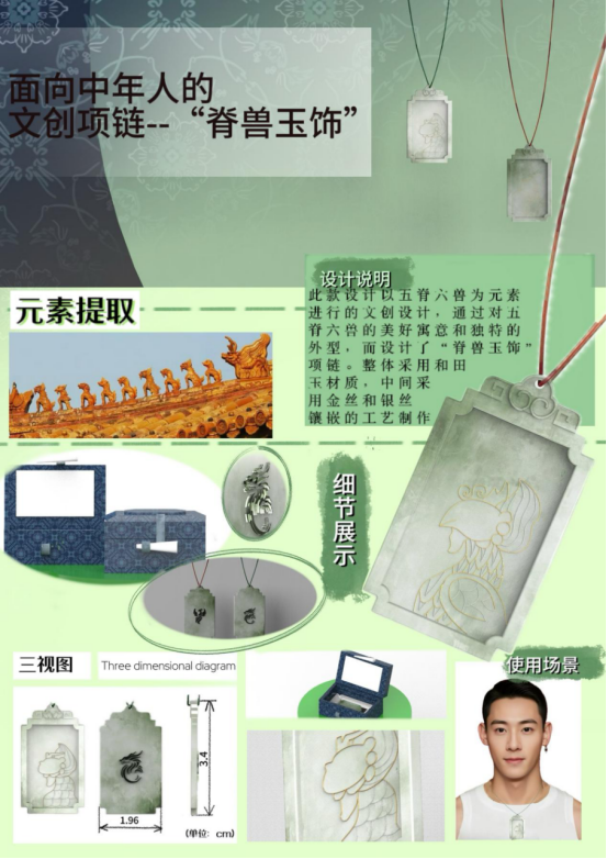 以五脊六兽为元素进行文创设计,通过对五脊六兽的美好寓意和独特的外型,而设计了“脊兽玉饰”项链。整体采用和田玉材质,中间采用金丝和银丝镶嵌的工艺制作。