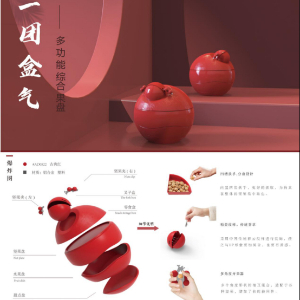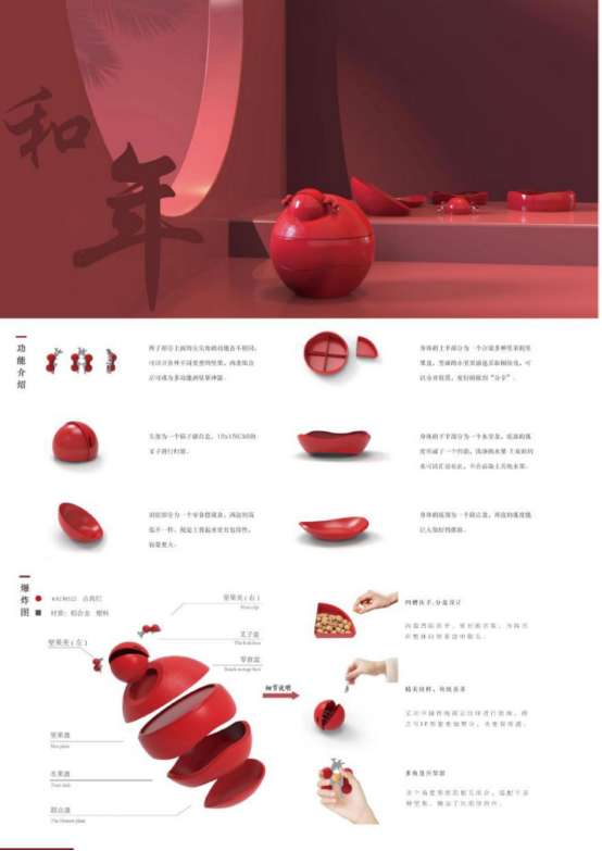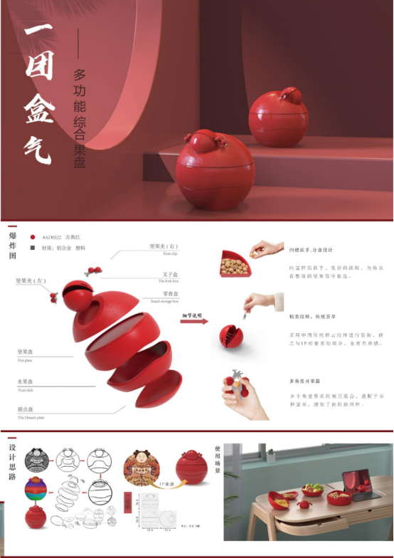通过对非遗的再创作,提取春节意象,设计出一款多功能综合果盘。产品基于国家级非物质文化遗产的桃花坞木版年画——《一团和气》,将茶几上所需的各个收纳盒进行整合,让我们的桌面更有序;通过抽象的年画形象,建立起一个IP化的综合果盘,组合起来又成为一个年画摆件。