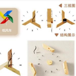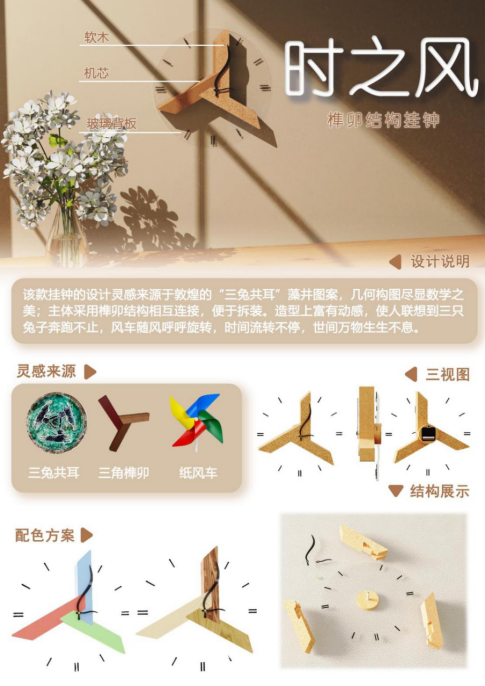 设计灵感来源于敦煌的“三兔共耳”藻井图案,几个构图尽显数学之美;主体采用榫卯结构相互连接,便于拆装。造型上富有动感,使人联想到三只兔子奔跑不止,风车随风呼呼旋转,时间流转不停,世间万物生生不息。