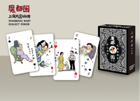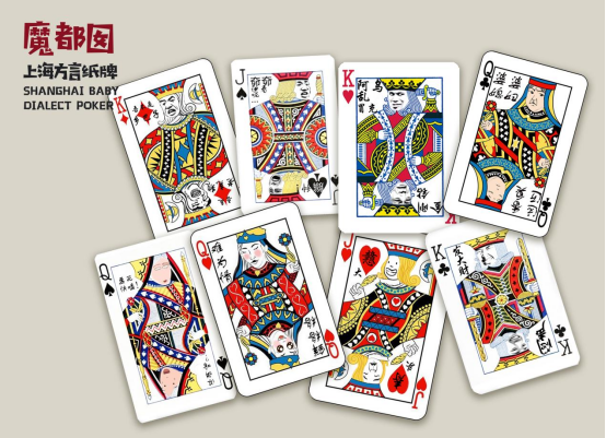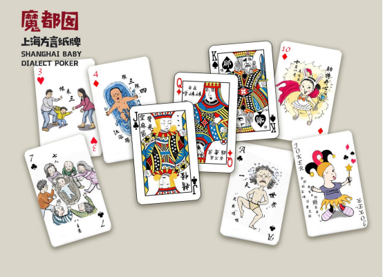 设计灵感来源于一个普通的上海三口之家,以上海调皮小囡的形象和家里经常发生的故事为基点,结合上海传统方言及俚语,将其与纸牌相结合创作而成。纸牌的正面为漫画图案加上海俚语的设计,背面是传统扑克花纹结合俚语解释的设计,外包装采用调皮小囡的头像和魔幻城市的图案元素结合设计。