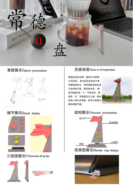 以u盘为载体,纪念碑红色的翅膀形状象征着自由、勇气或胜利等概念,在插入电脑上指示灯会亮,对抗洪救灾英雄的敬意和缅怀让更多的人能够了解和铭记这段历史。