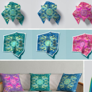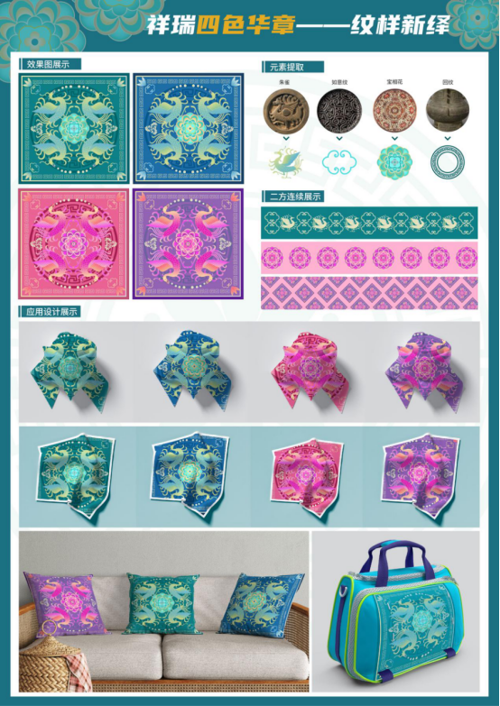 图案设计以回纹、如意纹样、宝相花纹样及朱雀形象为设计元素,融入中国传统美学精髓。绿色象征生机盎然,紫色寓意高贵神秘,红色展现热烈奔放,蓝色代表宁静深远,四色交织,展现出一幅幅富有层次和动感的图案。