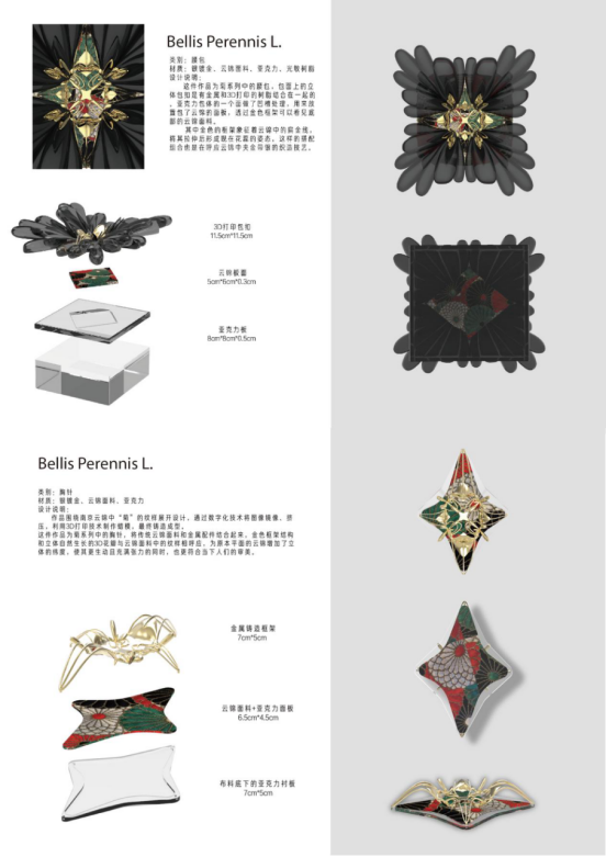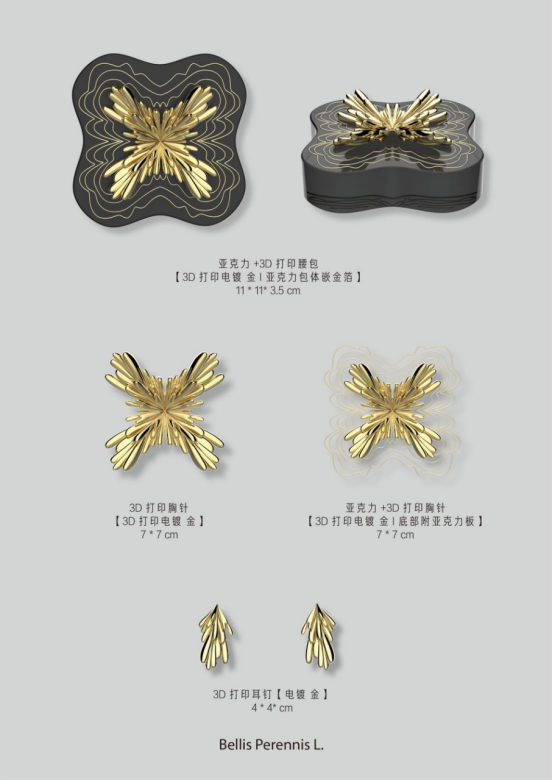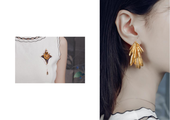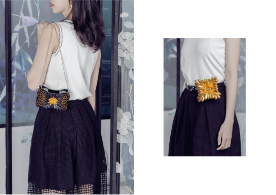 通过对南京云锦这一非遗技艺的深入研究,将其独特的织造技艺与现代设计手法相结合,旨在创造出既传承传统文化又契合现代审美的时尚配饰,整套设计以云锦中的“菊”纹样为核心,涵盖包、耳饰、胸针等。