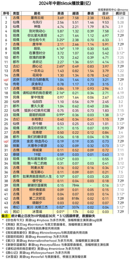 海外市场方面,《墨雨云间》被翻译成英、西、葡、泰、印尼、马来、越南语等多语种,上线即“爆”,首播荣登GoogleTrends热搜趋势,登顶多个国家或地区的热搜剧集词条,成为2024年优酷国际版最快登上全语种热榜Top1的剧集;相继发行到Netflix、Disney+、北美Viki、韩国AsianN、马来西亚Astro、新加坡Starhub、Appletv等十数家全球范围内的流媒体平台;在IMDB互联网电影资料库获评8.1分,在亚洲剧集评论网站MyDramaList评分8.9。凭借13.65亿播放量高居TikTok2024年中剧第一,在TikTok上各个语种的讨论词条,断层式领先其他剧集,其中越南语词条超过6亿条,泰语词条将近2亿条;位列Netflix、泰国TrueID、韩国MOA、越南FPT等平台TOP1;在Facebook的“陆剧讨论社”板块里,整个6月,该小组基本都被该剧“包圆”。目前,海外全平台播放量近2亿,海外平台曝光近4亿。