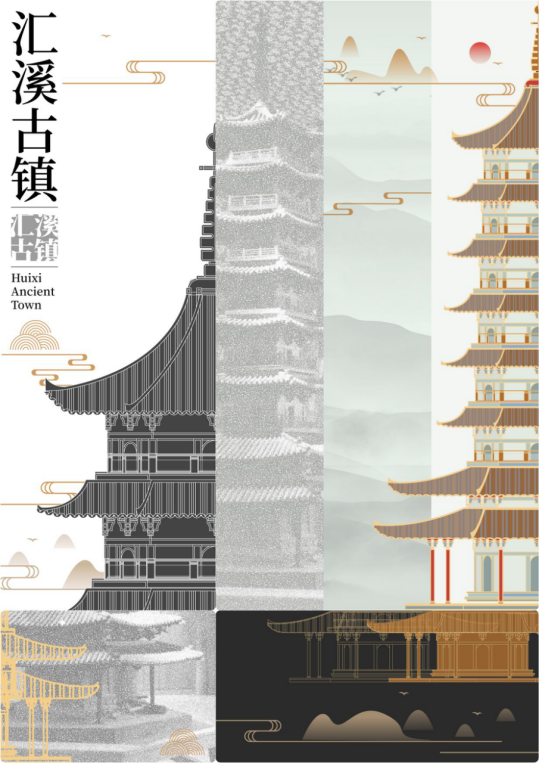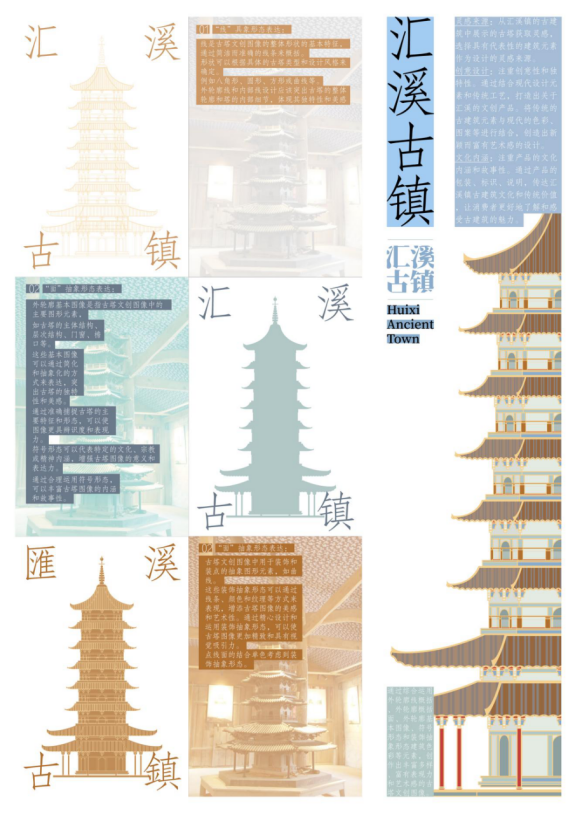 从汇溪镇的古建筑中展示的古塔获取灵感,选择具有代表性的建筑元素作为设计的灵感来源。注重创意性和独特性,通过结合现代设计元素和传统工艺,打造出关于汇溪的文创产品。将传统的古建筑元素与现代的色彩、图案等进行结合,创造出新颖而富有艺术感的设计。