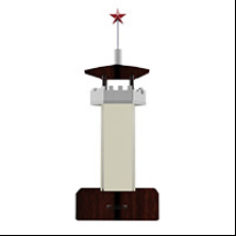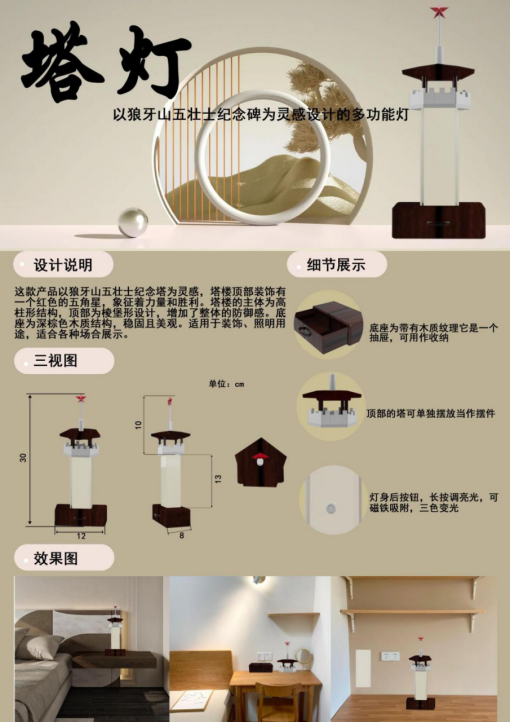 这款产品以狼牙山纪念塔为灵感,塔楼顶部红色的五角星,象征着力量和胜利。塔楼的主体为高柱形结构,顶部为棱堡形设计,增加了整体的防御感。底座为深棕色木质结构,稳固且美观。底部的抽屉可以作为一个存储单元或一件家具,可以装饰或用来收纳。