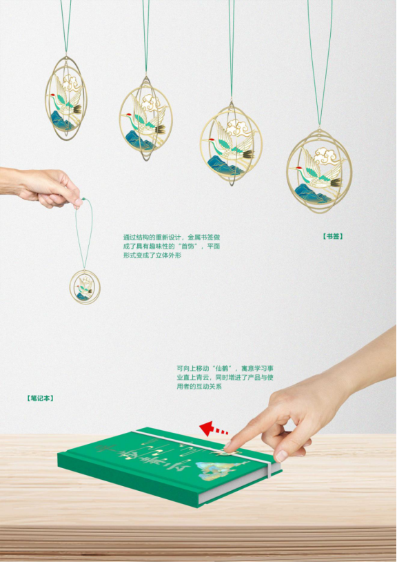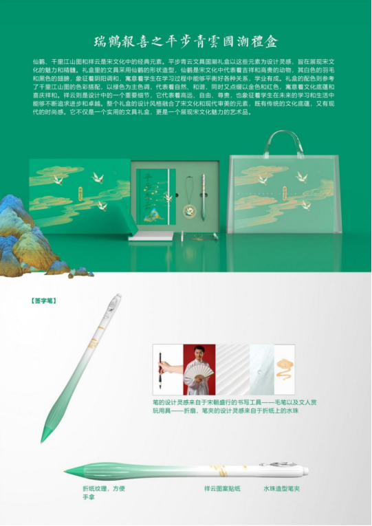 设计灵感旨在展现宋文化的魅力和精髓,礼盒里的文具采用仙鹤的形状造型,仙鹤是宋文化中代表着吉祥和高贵的动物,其白色的羽毛和黑色的翅膀,象征着阴阳调和。礼盒的配色则参考了千里江山图的色彩搭配,以绿色为主色调,代表着自然、和谐,同时又点缀以金色和红色,寓意着文化底蕴和喜庆祥和,祥云则是设计中的一个重要细节。