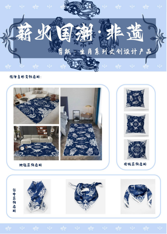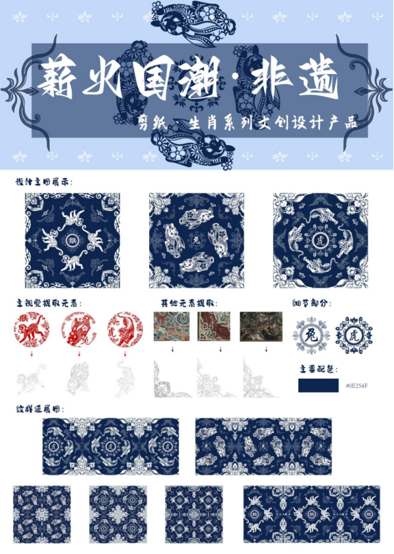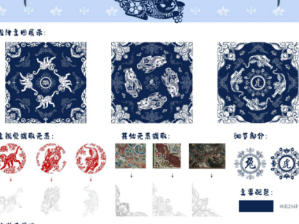 作品主要是以生肖的剪纸为主,与敦煌壁画上的藻井局部角纹样元素和中国古代砖石上的符文结合进行设计,增加画面的内容感。其次提取了非遗剪纸常用的部分小元素,进行组合装饰补充画面的层次感,采用四方连续的手法进行设计。