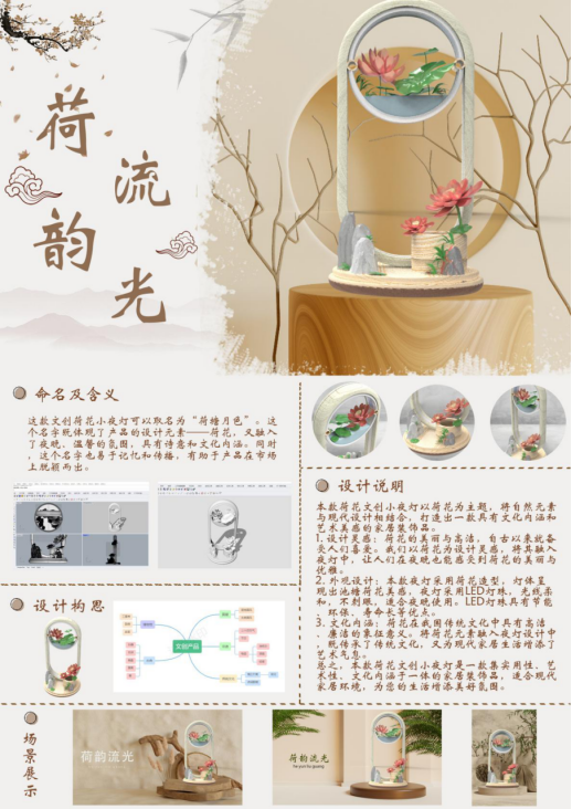 以荷花为设计灵感,将其融入夜灯中,让人们在夜晚也能感受到荷花的美丽与优雅。小夜灯以荷花为主题,将自然元素与现代设计相结合,打造出一款具有文化内涵和艺术美感的家居装饰品。