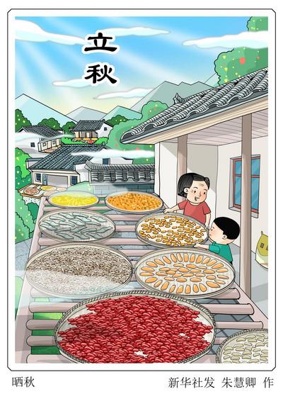 “一叶梧桐一报秋,稻花田里话丰收。”华东师范大学民俗学研究所教授田兆元表示,在古代,立秋是“四时八节”之一,格外受重视。在此时节,民间有很多传统习俗,比如“晒秋”。这指的是农民会将农作物如玉米、辣椒等拿出来晾晒,色彩斑斓、景象美丽,以此来展示丰收成果,寄托对新一季丰收的祈愿。