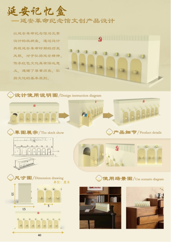 以延安革命纪念馆为元素设计的收纳盒,通过设计再现延安革命时期的历史风貌,遵循尊重历史、弘扬文化的基本原则,进一步弘扬延安精神、传承红色文化。