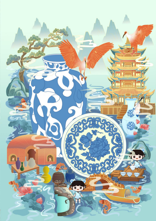 产品通过景德镇手工制瓷技艺将传统纹样与现代艺术图形相融合,从制瓷的工艺流程绘画四个小场景,再通过江西特有的建筑物、植物、动物、景物进行画面的装饰,能更好的看出制瓷的过程,IP为卡通的人物形象,以瓷器作为装饰点缀。