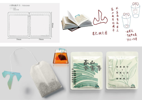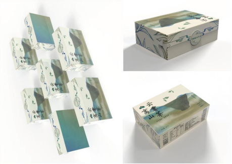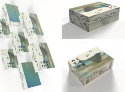 本包装以水墨画风为主,采用书法字体“山”,简约而不失精致。包装采用《千里江山图》的配色,主要用了石青、赭石、松柏绿等颜色,与茶叶淡雅的气质相称,营造出清新自然的氛围。外包装正面主要描绘邈远茶山之貌,茶叶飘飘入杯湾。
