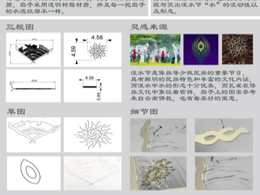 本产品以傣族泼水节为灵感,扇子中的图案是佛教“五树六花”之一,有着美好的寓意,扇子右方把手的形态是参考孔雀羽毛的形状以及孔雀的形态,把手采用金属材质,扇子采用透明树脂材质,并且每一把扇子的水波纹都不一样。
