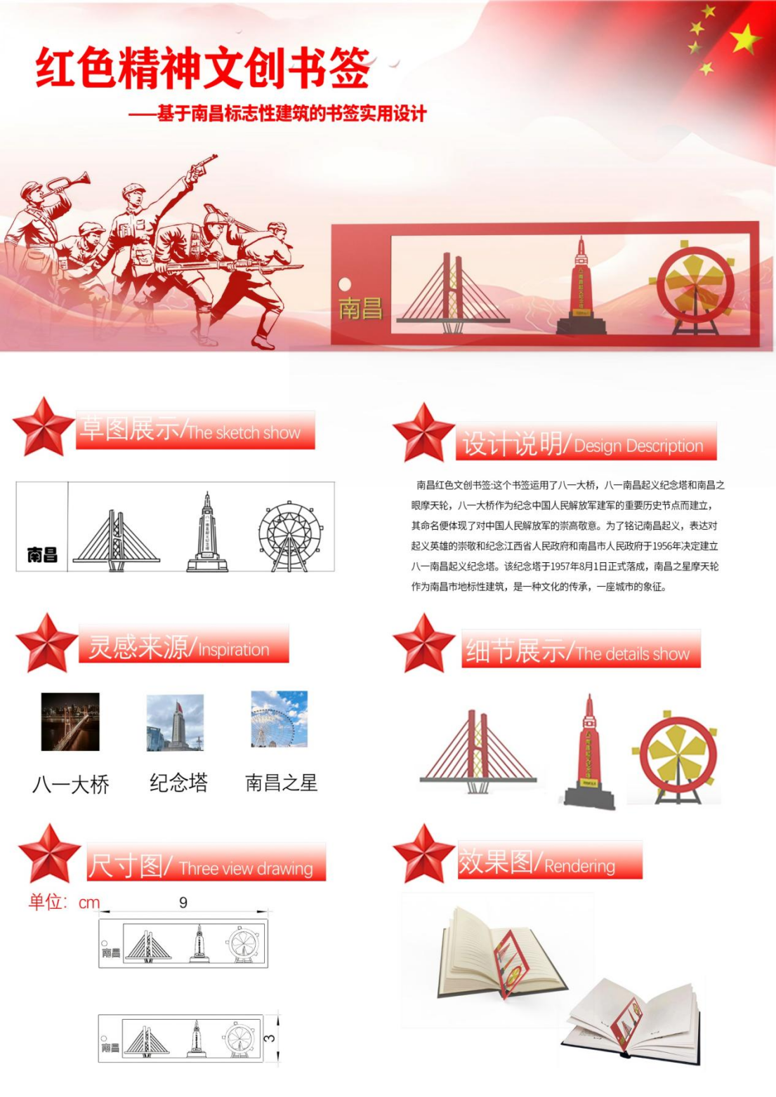 南昌红色文创书签:运用了八一大桥,八一南昌起义纪念塔和南昌之眼摩天轮,是一种文化的传承,也是一座城市的象征。