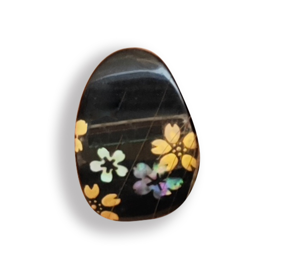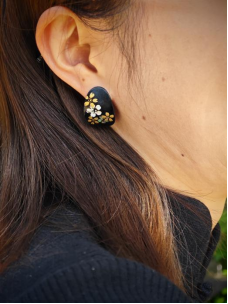采用中国千年传承的大漆工艺,融合点螺这一精细镶嵌技术,主体设计为轻盈的花卉形态,花瓣边缘略带弧度,增添动感,同时考虑佩戴舒适度,确保即使长时间佩戴也轻松自在。
