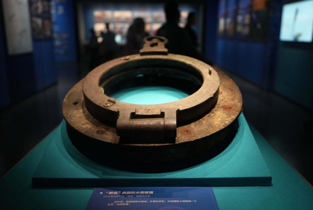 这是展出的“致远”舰圆形水密舷窗(8月6日摄)。