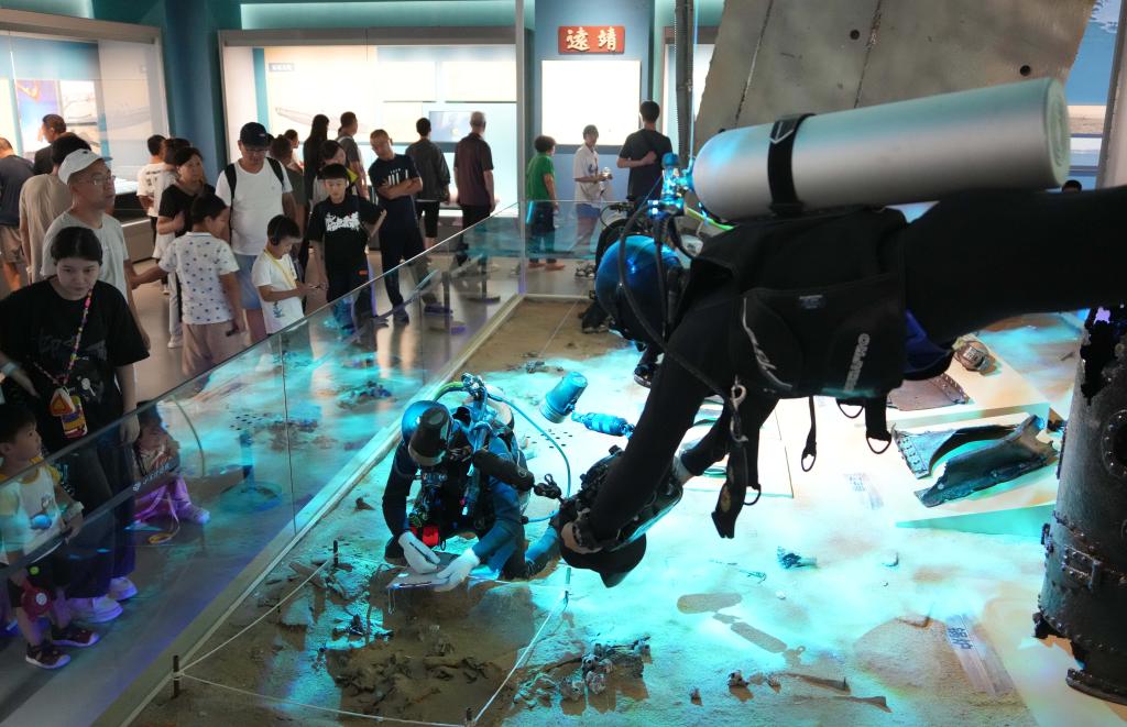 8月6日,参观者在观看甲午沉舰水下考古模拟现场。