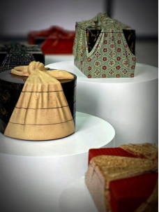 本次设计上提取了原作的设计精髓,以创新性的设计语言进行再创造,保留“平安百福”寓意,结合不同形制完成五件造型各异的包袱式漆盒