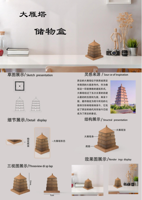 此产品运用了大雁塔的形状,大雁塔位于中国陕西省西安市,结合了现代审美和功能性,设计出了该文具,让大雁塔文创产品满足不同的年龄段和消费者群体要求。