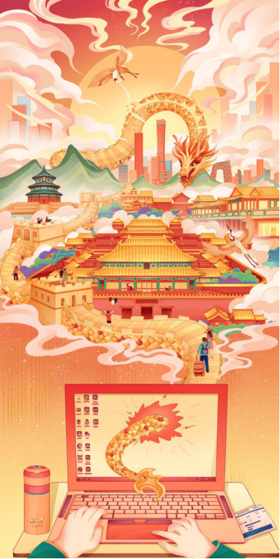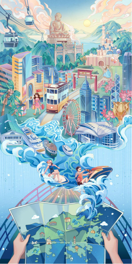 画面以第一人称视角乘坐不同的交通工具,采用以小见大的手法,展开城市画卷。本系列分别选择了香港、北京等四个城市,分别对应了祖国东南西北的热门旅游地及不同的地域风光。色彩上采用了红黄橙蓝等明快鲜艳的颜色作为不同城市的主色调,激发人们的旅游欲望。