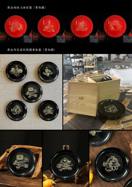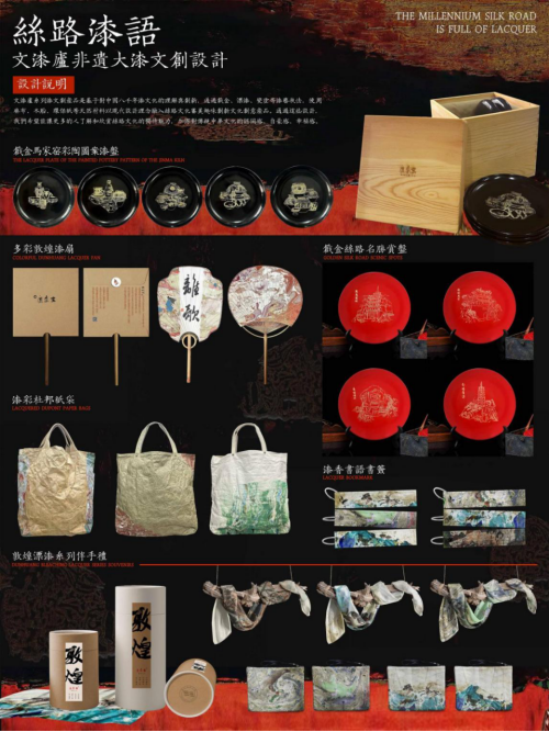 基于对中国漆文化的理解与创新,通过戗金、漂漆、变涂等漆艺技法,使用麻布、木胎、环保纸等天然材料以现代设计理念融入丝路文化审美趣味,创新文化创意产品。