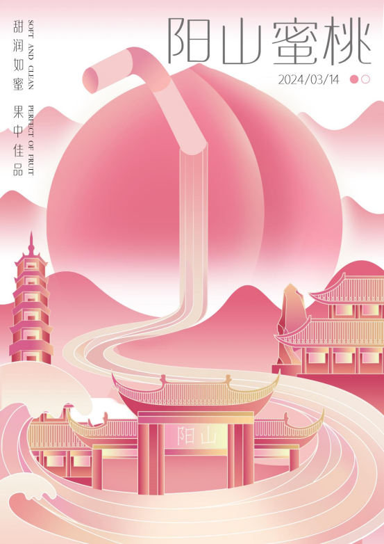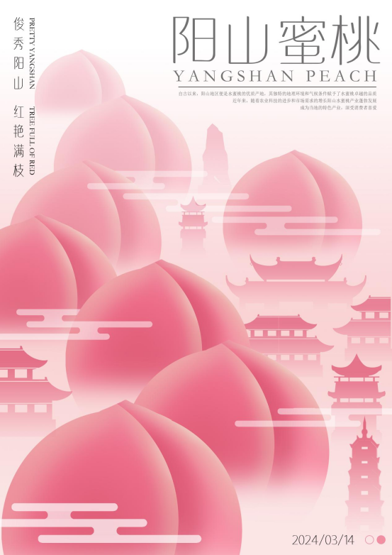 本设计以桃为山,设计以桃子本身为灵感,桃身起伏,宛如山峰簇拥,以此来展现出生机勃勃的自然景象。其间点缀标志性古建筑,古朴典雅,与山桃相映成趣,希望借此设计来彰显了地域特色和阳山的文化底蕴,更希望在设计中能将阳山自然与人文融为一体。