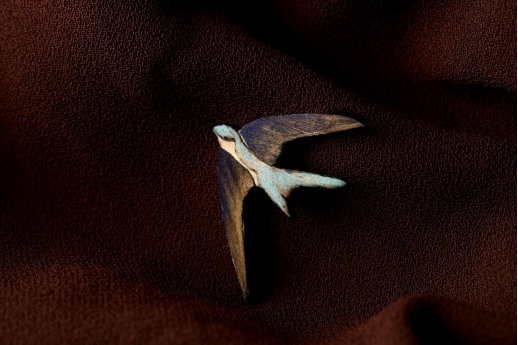 整个作品主体采用了大漆的脱胎工艺,并在胸针的表面,使用堆漆浮雕工艺,来达到飞燕的立体效果。又在其燕身,采用撒金工艺,让金粉和虫翅粉相互交错,形成鸟身羽毛纹理。