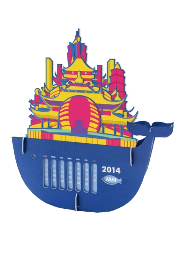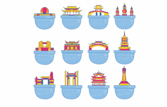 本产品以杭州为背景,设计城市限定日历,采用的建筑包括杭州国际会议中心、五王殿、苏堤、三潭印月、杭州市民中心、法喜寺、宋城、雷峰塔、灵隐寺、武林门码头、城隍阁、杭州环球中心等一系列杭州著名旅游景点建筑物。
