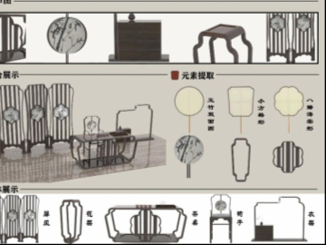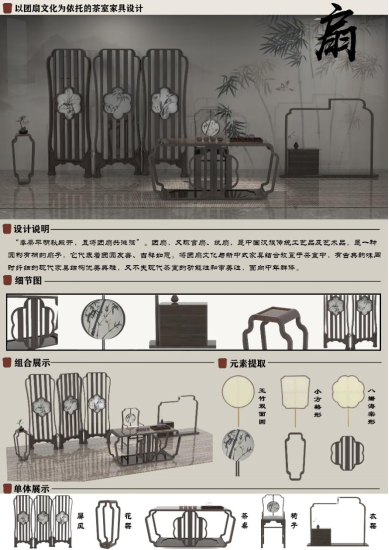 将团扇文化与新中式家具结合放置于茶室中,有古典韵味同时结构优美典雅,又不失现代茶室的功能性和审美性。