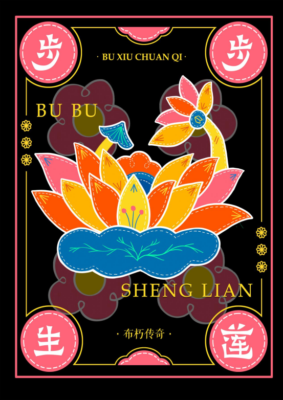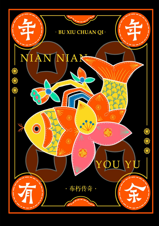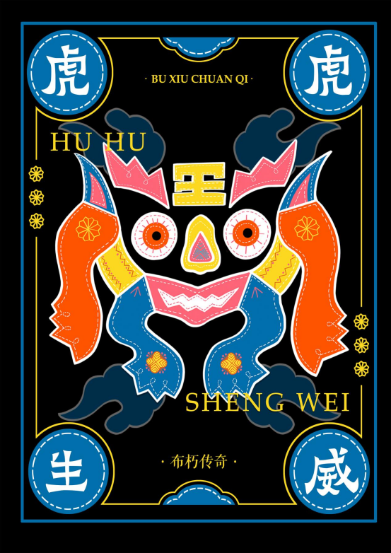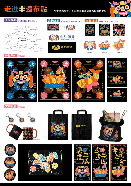 整个作品是以湖北省阳新县非物质文化遗产——阳新布贴为设计灵感,根据众多传统阳新布贴作品中的经典图案元素为设计基础。它们被细致地勾勒出来,通过鲜明的色彩和精细的纹理呈现出传统文化的魅力,结合了现代元素,为传统文化注入了新的活力与时尚气息。