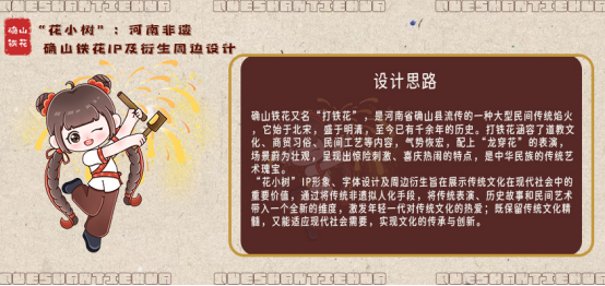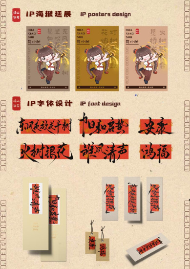 “花小树”IP形象、字体设计及周边衍生旨在展示传统文化,通过将河南传统非遗“确山铁花”拟人化,将传统表演、历史故事和民间艺术带入一个全新的维度,激发年轻一代对传统文化的热爱。