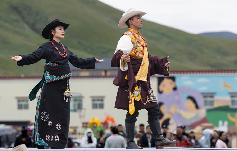 8月10日,在四川省色达县,当地藏族群众穿着藏族服饰进行展示。