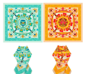 第二款橘色丝巾借鉴敦煌文化中藻井的构图形式,以宝相花为主体纹样,周边饰以缠枝纹、折枝纹、石灯幢图案,达到“穹然高起,如伞如盖”的视觉效果。经过艺术的处理加工融合而成,整体图案的应用体现出中国传统文化“图必有意,意必吉祥”的特征。
