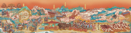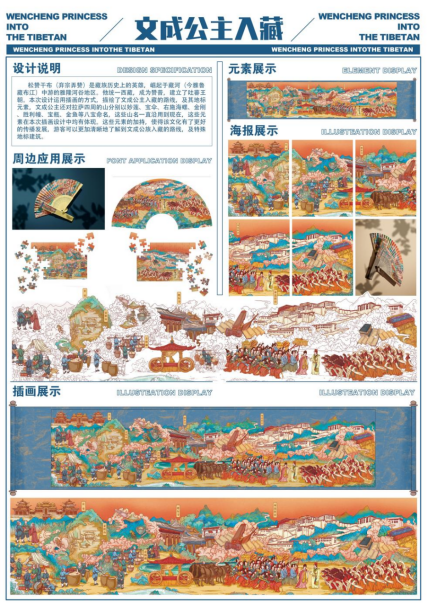 本次设计运用插画的方式,描绘了文成公主入藏的路线,及其地标元素,文成公主还对拉萨四周的山分别以妙莲、宝伞、右施海螺、金刚、胜利幢、宝瓶、金鱼等八宝命名,这些山名一直沿用到现在,这些元素在本次插画设计中均有体现,可以更加清晰地了解到文成公族入藏的路线及特殊地标建筑。