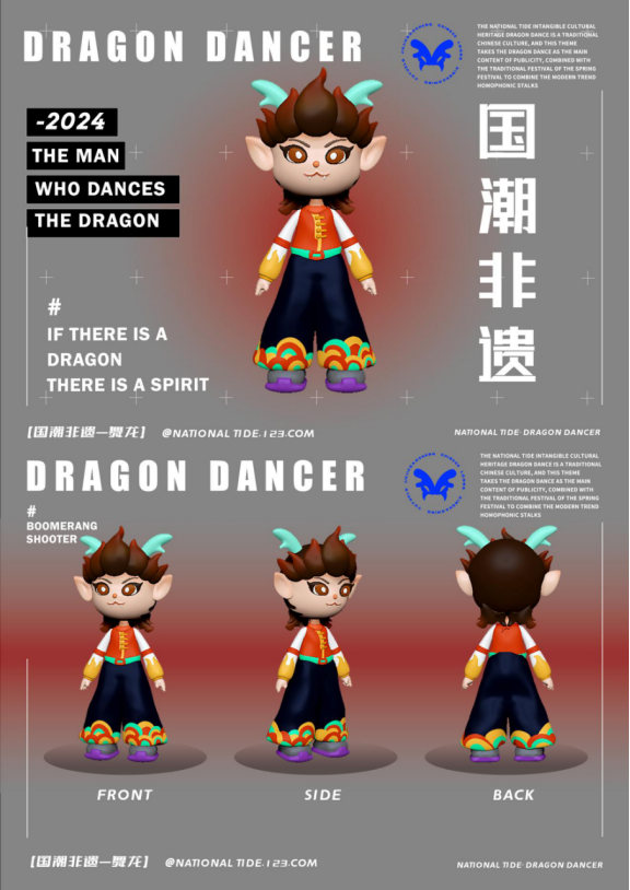 文创产品的灵感是源于中国传统文化舞龙。将舞龙的非遗文化与现代文化“谐音梗”相结合,创作出三个主题“有龙则灵”“鱼跃龙门”“财运兴龙”。根据每个主题衍生出新的场景“打麻将” “贴春联”“节节高升”等相关小场景,同时结合春节主题设计出与春节相融合的系列海报与创意元素。