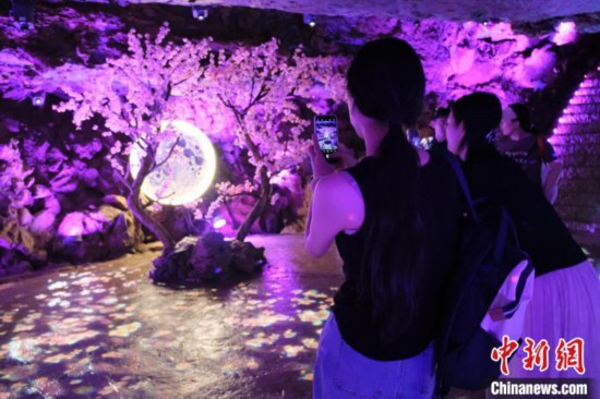 今年的七夕节恰逢周末,“三生桃源”项目主理人周伟正忙着确认桃源洞内外的各项布置。“我们结合溶洞原有的地形地貌进行设计,在洞内设置了‘星月对话’‘云梦仙桥’‘花洲仙船’等场景,确保往来游客能在这里凑齐九宫格打卡。”周伟介绍。