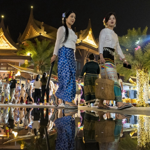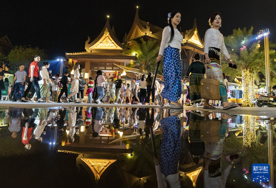 身着少数民族服饰的游客在芒市傣族古镇内游玩(资料图)。新华社 陈欣波 摄
