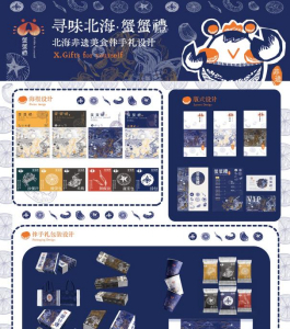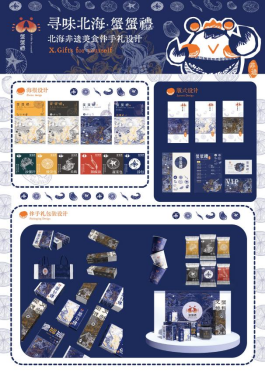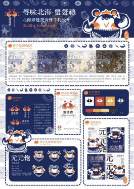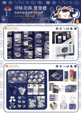本设计主视觉插画采用了版画的绘画手法,在视觉插画中提取了蟹仔粉为主要视觉元素,并搭配蟹仔粉中的其他配料,如:虾、鸡蛋、西红柿、辣椒、柠檬、香菇、沙蟹等,辅助元素提取了非遗传统沙蟹汁沙制作技艺过程中的器物蒜臼子与酒罐子。在视觉插画配色中,选用了三种颜色分别进行三种搭配方式。