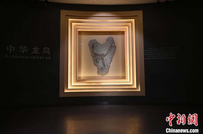 8月13日,辽宁朝阳鸟化石国家地质公园展出的中华龙鸟化石。中新社记者 于海洋 摄